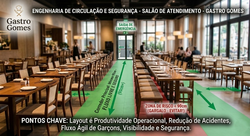 Corredores inferiores a 90cm comprometem o fluxo de garçons e aumentam risco de acidentes — especialmente com alto consumo de bebidas.