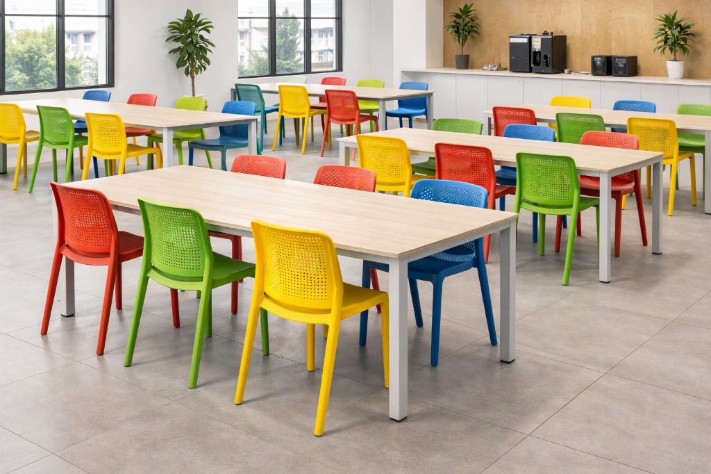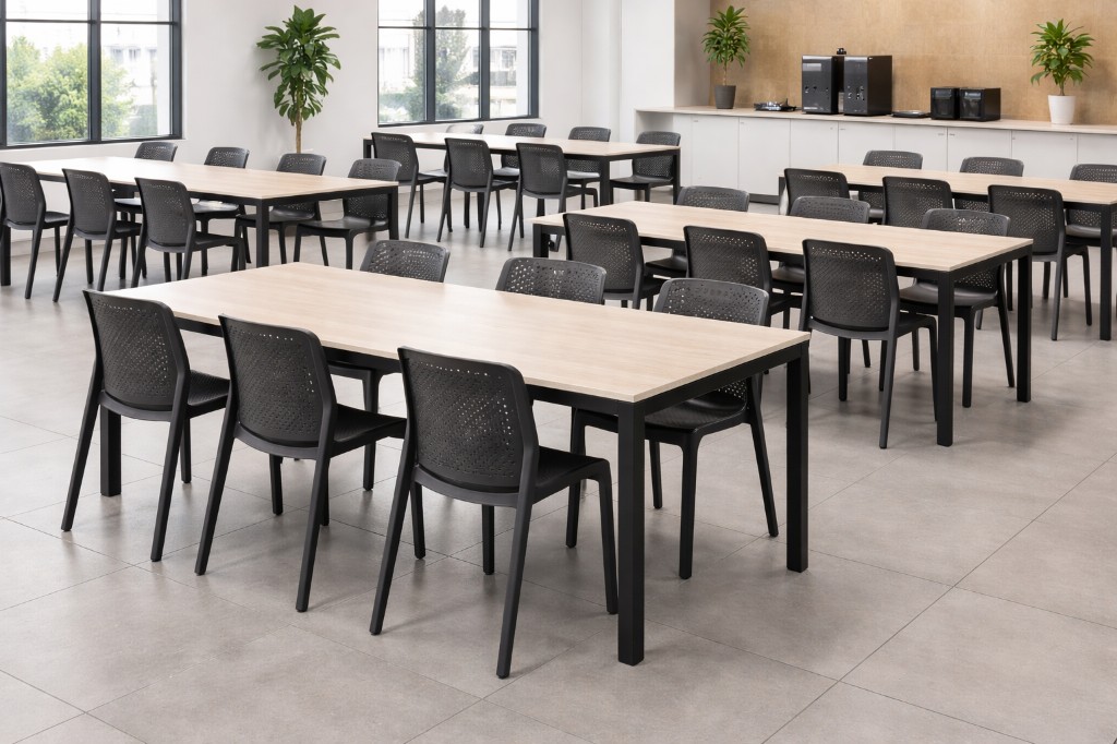 Em um refeitório industrial, a circulação é intensa. Mesas instáveis ou cadeiras frágeis podem causar acidentes — e acidente gera custo jurídico e trabalhista.